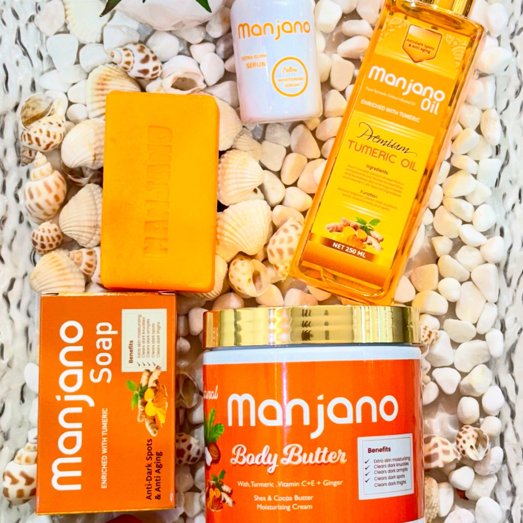 A curated set featuring multiple Manjano body products (such as butter, serum, and soap) to cleanse, hydrate, and improve skin tone over time.